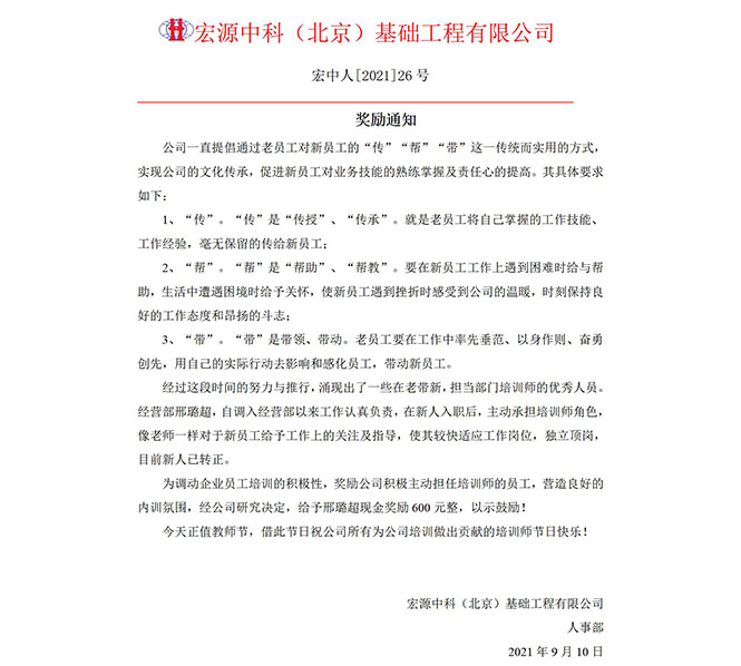 宏源中科一直提倡通過(guò)老員工對(duì)新員工的“傳”“幫”“帶”這一傳統(tǒng)而實(shí)用的方式,實(shí)現(xiàn)公司的文化傳承,促進(jìn)新員工對(duì)業(yè)務(wù)技能的熟練掌握及責(zé)任心的提高。